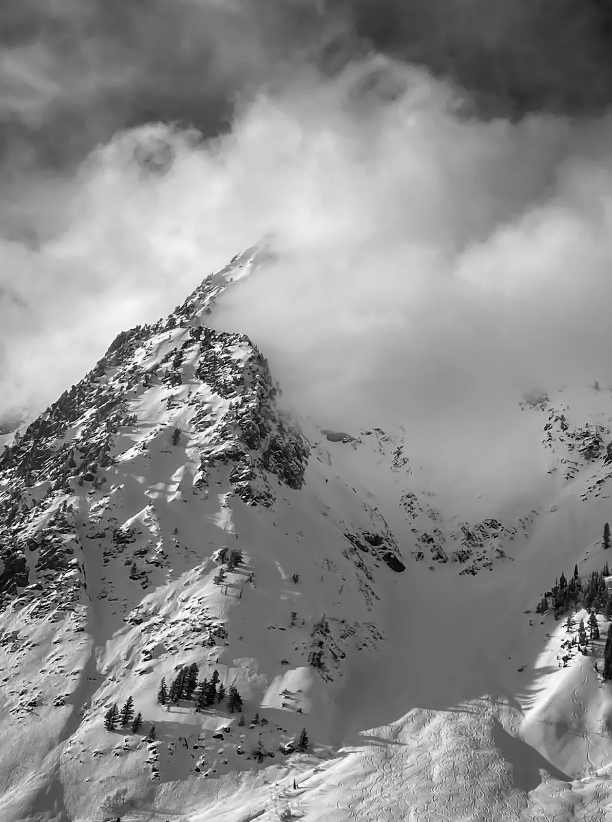 Clouds over the Wasatch frame Pfiefferhorn, from Hidden Peak, Snowbird.