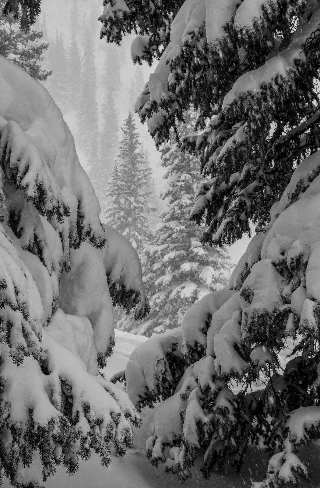 Snowy Evergreen Window, Alta UT BW View fullsize